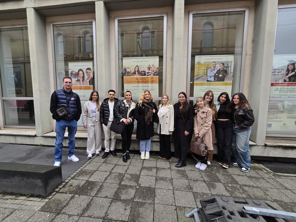 Wie schnell „Feuerzauber“ zur gefährlichen Körperverletzung werden kann, erlebte die Klasse 3 RE 1 am 26.09.26 bei einem Besuch des Amtsgerichts Karlsruhe. Die Abschlussklasse der Rechtsanwaltsfachangestellten besuchte eine Gerichtsverhandlung der sog. Pyro-Prozesse, angeklagt waren drei KSC-Ultras. Im November 2022 hatte bei einem Heimspiel des KSC gegen den FC St. Pauli die Pyro-Choreografie von Rheinfire Karlsruhe zu verletzen Zuschauern geführt. Die drei Angeklagten mussten sich vor dem Amtsgericht verantworten.