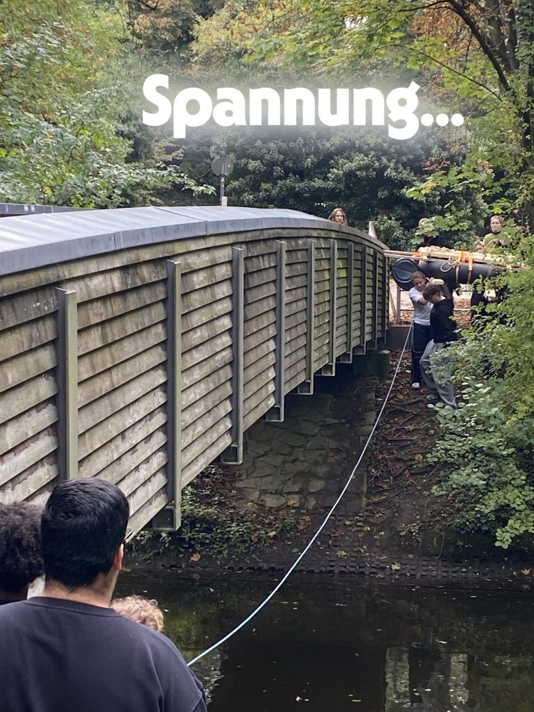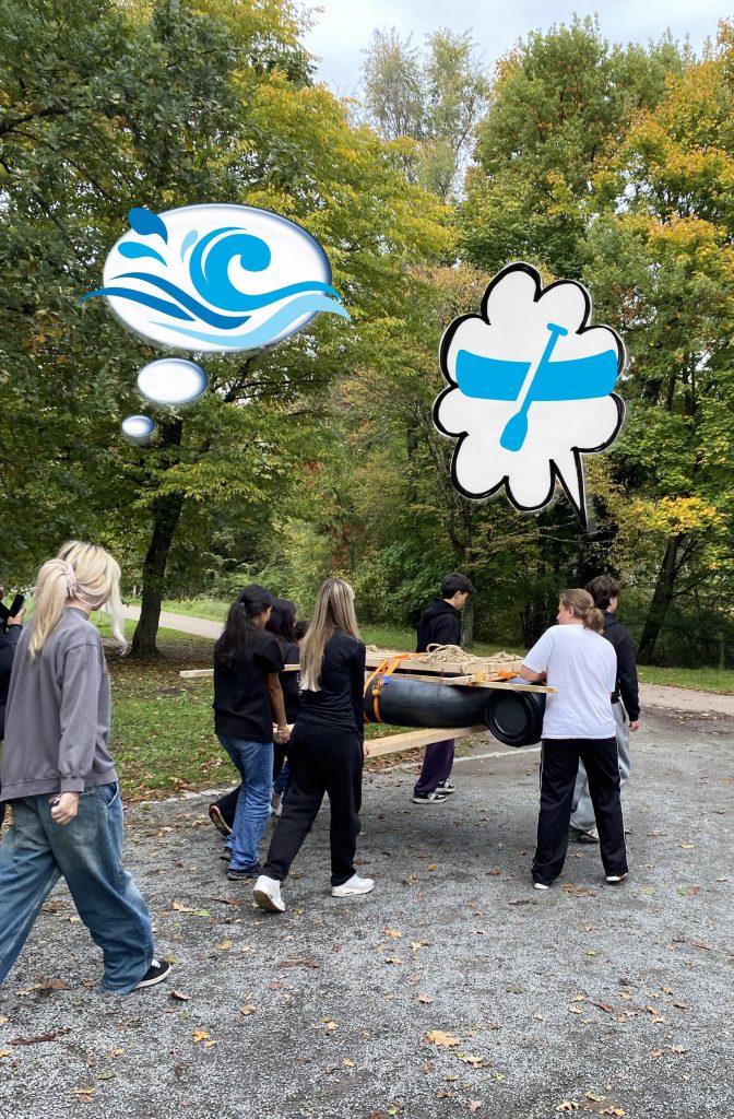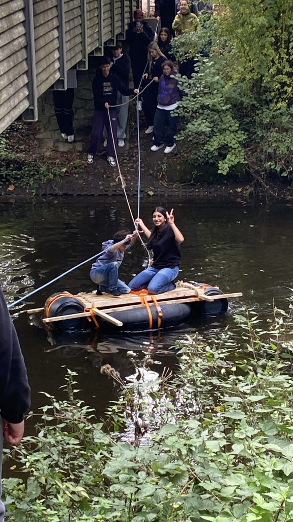 Gemeinsam stellte sich die Klasse der Herausforderung, ein eigenes Floß zu bauen – und das mit vereinten Kräften! Nach intensiver Planung und handwerklichem Einsatz konnte das fertige Floß schließlich zu Wasser gelassen werden. Ein Teil der Klasse wagte sogar die Überquerung des Flusses.